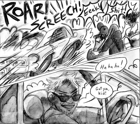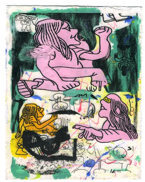 My sketchbook drawings usually feel the most alive. The stakes are low— my sketchbook is messy. I keep it full of silly drawings and notes to myself— quick doodles of strangers, ideas for comics, goofs to make my friends and partner laugh, often drawn with very accessible mediums, like kids washable markers and my favorite cheap fountain pen. When it comes to something I’m intending to be a more finished piece, I’m often working with nicer materials on better paper, adding this new pressure to not mess up and waste the good materials or my serious work time— it’s really no surprise that something gets lost in translation. In the end, a piece might look more polished, but I’m often left a little unsatisfied.